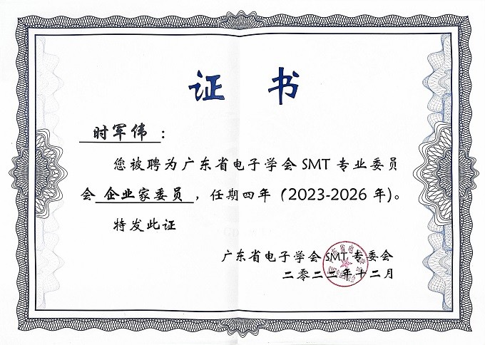 世椿智能董事长时军伟先生被聘为广东省电子学会SMT专业委员会“企业家委员”。