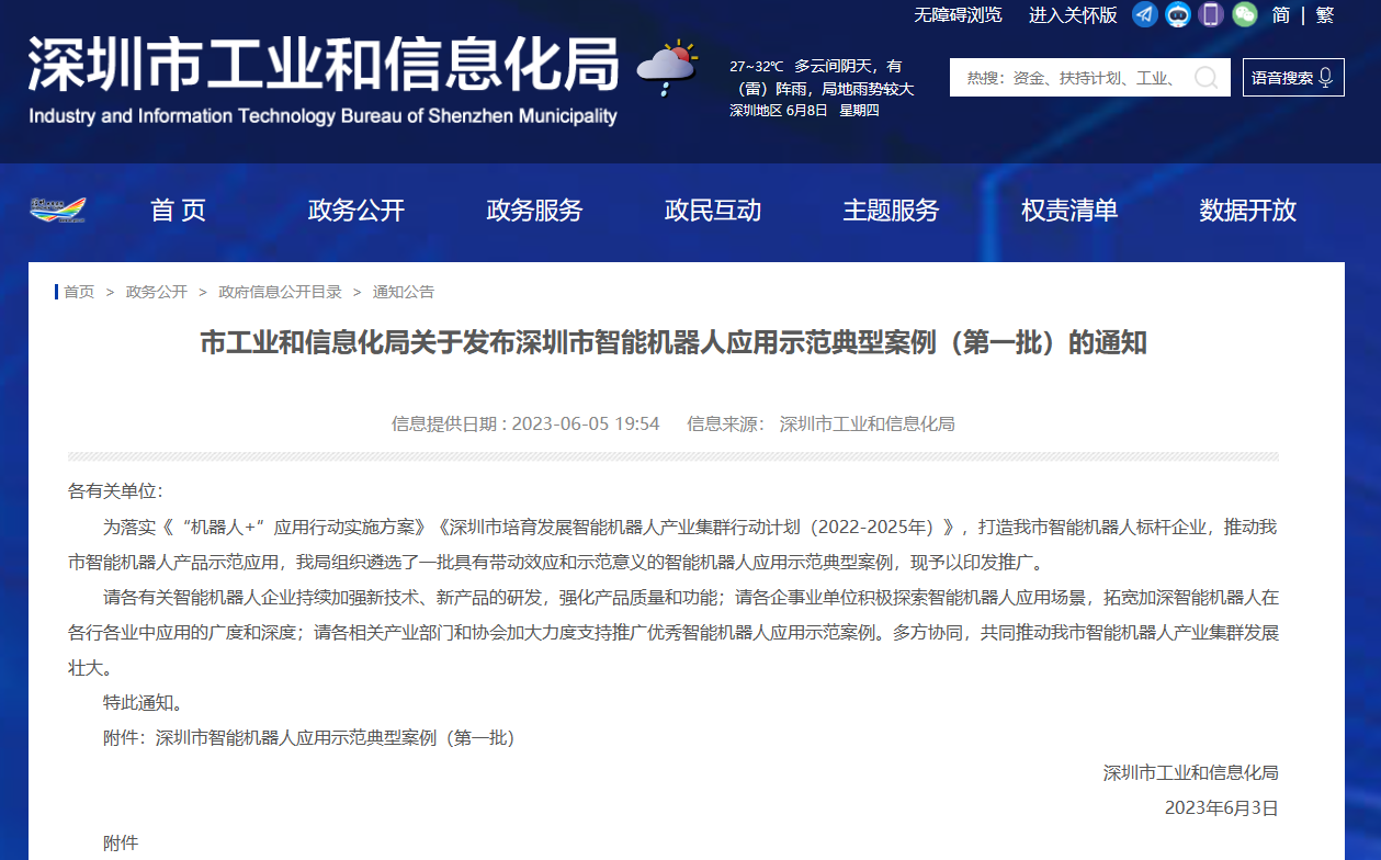 《深圳市智能机器人应用示范典型案例》是深圳市为落实《“机器人+”应用行动实施方案》《深圳市培育发展智能机器人产业集群行动计划(2022-2025年)》,打造深圳市智能机器人标杆企业,推动深圳市智能机器人产品示范应用,由深圳市工业和信息化局委托深圳市机器人协会组织和征集的一批具有带动效应和示范意义的智能机器人应用示范典型案例。现已在政府官网公示,并予以印发推广。