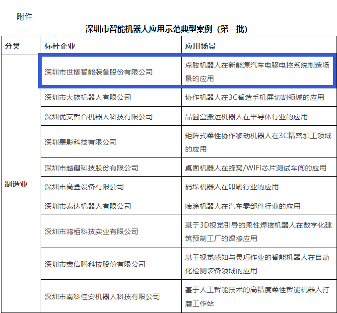 近日,深圳市人民政府门户网站、深圳市工业和信息化局官网等公布了《深圳市智能机器人应用示范典型案例》(第一批),深圳市世椿智能装备股份有限公司(简称世椿智能)所申报的“点胶机器人在新能源汽车电驱电控系统制造场景的应用”案例被收录其中。